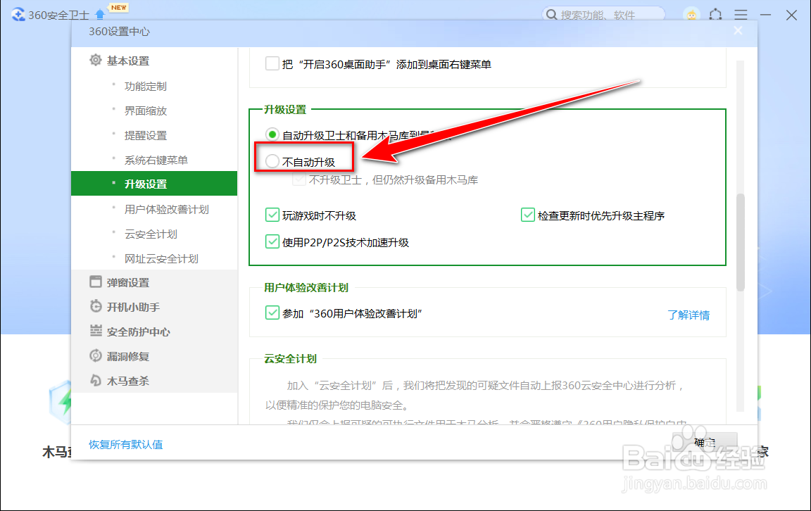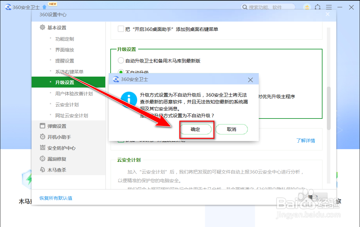 6、返回“升级设置”页面中,勾选“不升级卫士,但仍然升级备用木马库”,点击“确定”按钮。