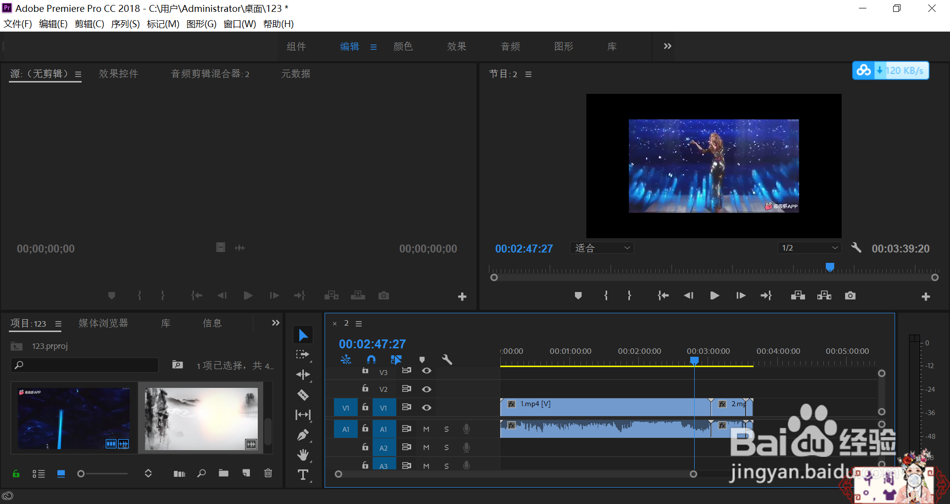 1、打开PR,将两段素材视频以及转场视频都导入进去。