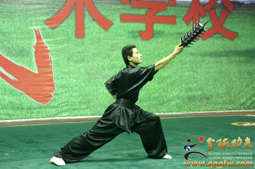 动作要领:震右脚,左脚向前上步成左弓步,同时狼牙棒棒头向右后方抡出一周。棒头向前冲出后,再 在头顶横扫一周停于身体右前方(图6)。