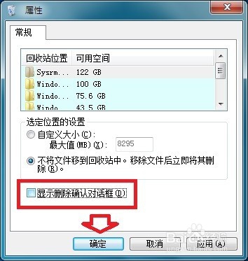 8、如果删除文件之后,不喜欢弹出对话框,可以去除 显示删除确认对话框。选项前的对勾→确定。也可以点选 不将文件移到回收站中。删除文件后立即删除。