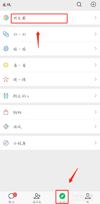 1、在我们需要发朋友圈的时候,首先应点击微信界面下方的“发现”按钮,点击“朋友圈”(如图所示)。