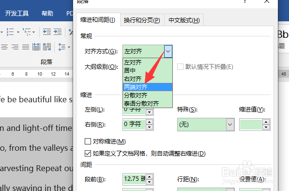 3、点开对齐方式,选中为“两端对齐”
