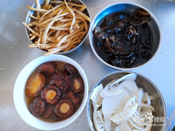 1、四鲜烤麸用到的四鲜:黄花菜,黑木耳,干香菇,玉兰片,都是用的干品,提前用水泡发。
