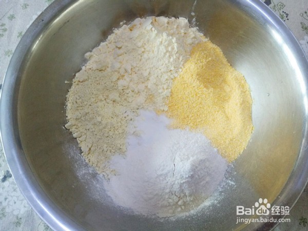 3、面盆里放好玉米面,加2克盐,如果喜欢甜口也可以加10-20克白糖。