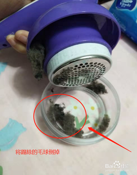 5、第五步:将毛呢衣服上的毛球全部踢除干净后,需要将踢毛器里面毛球清理干净,方便下一次使用。