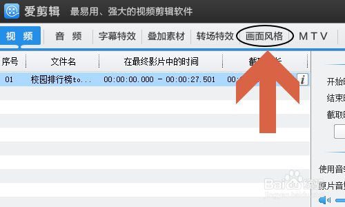 2、添加以后页面的右侧会有视频的预览,见图一...然后我们点击软件上方工具栏中的“画面风格”;