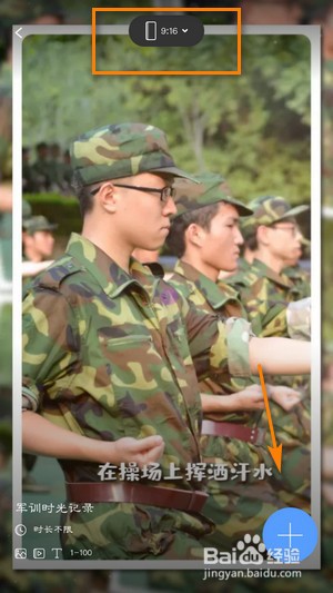 3、选好比例,点击加号上传手机里的军训图片和视频就好啦