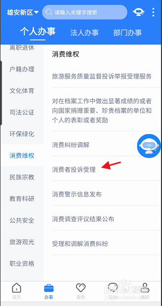 5、点击左下方首页右侧的办事进入,找到消费维权,点击右侧的消费者投诉受理进入