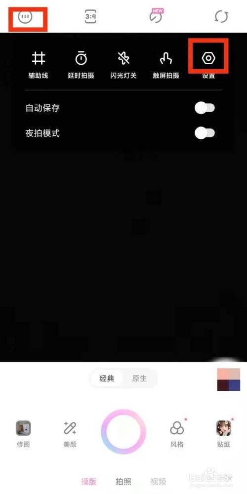 1、首先在一甜相机左上角点击图标后,选择弹出栏内的设置选项。
