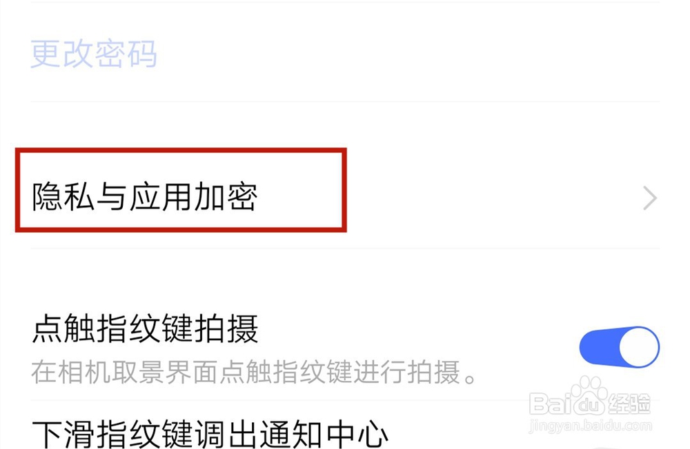 3、进入到指纹、面部与密码界面后,点击【隐私与应用加密】选项。
