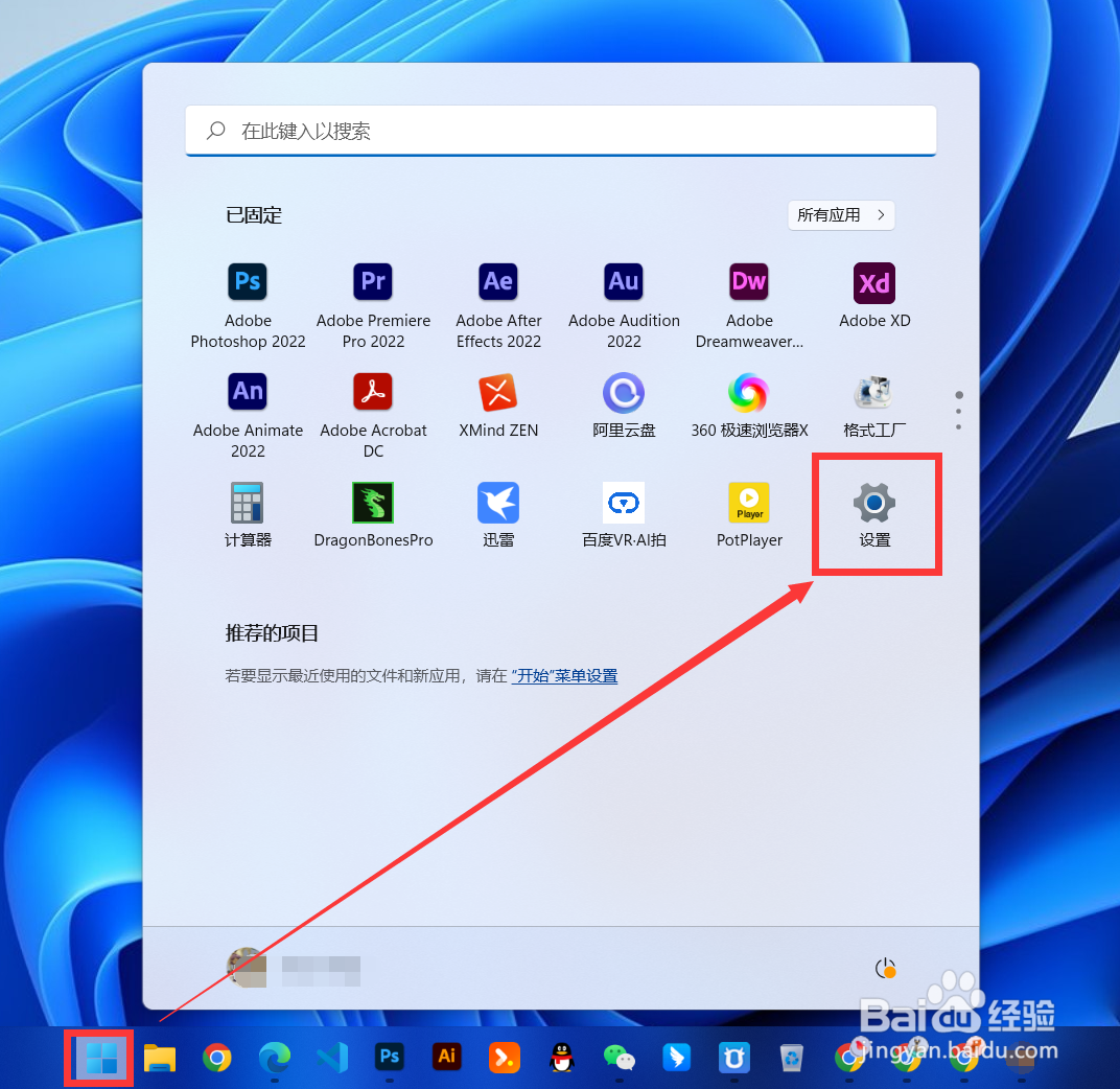 1、鼠标点击底部任务栏中的【开始菜单】,再点击页面中的【设置】。