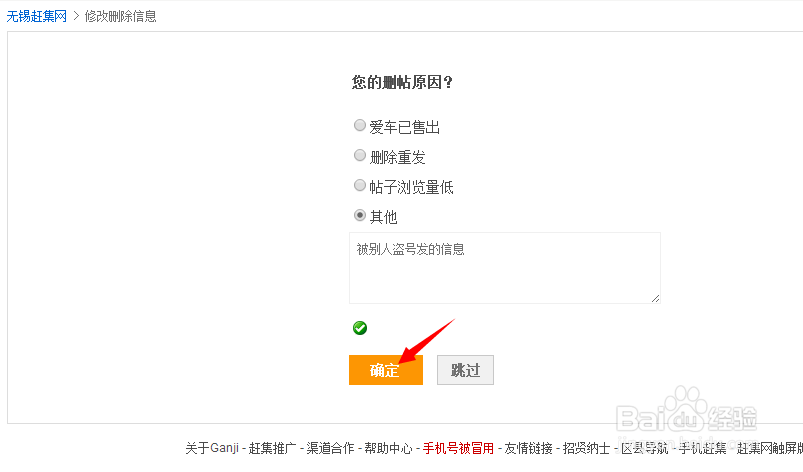7、点击后,赶集网会弹出页面,问你删除帖子的原因,可以根据实际填写,也可以不填,点击跳过。