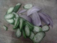 6、油热放入洋葱,黄瓜,盐,酱油。