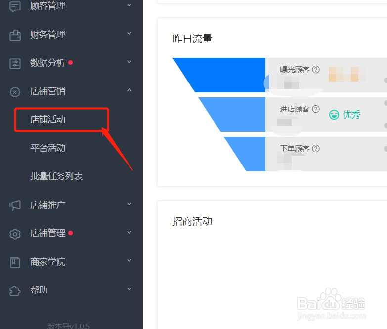 2、左侧往下滑动,找到“店铺营销”并点击,再点击“店铺活动”选项,则可以进入到创建活动界面。
