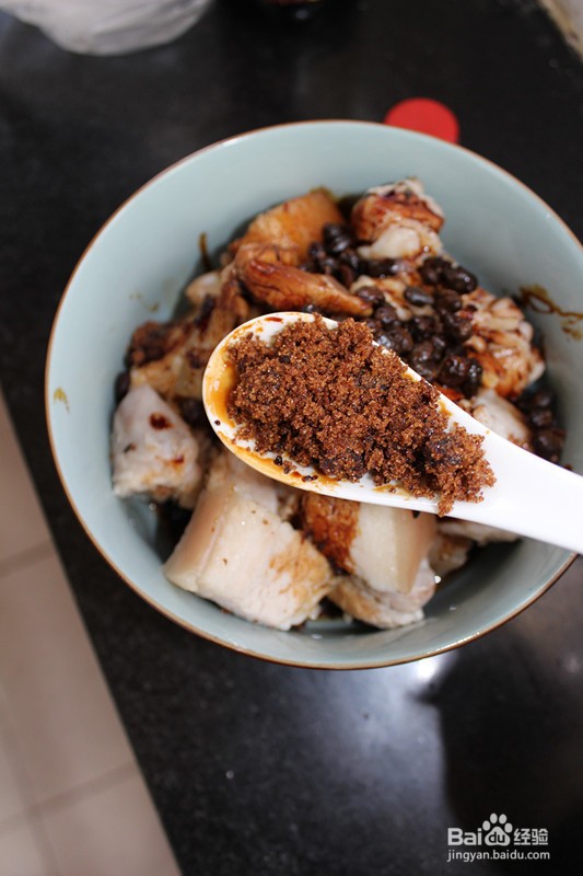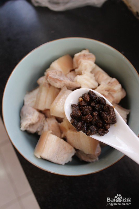 2、焯好的肉洗干净放碗里,1斤肉加2勺豆豉。