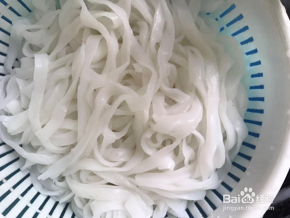 1、准备食材。河粉用水冲洗干净,沥干水待用。猪肝切片,芥菜切小段,葱切小。姜切片或丝都可以。