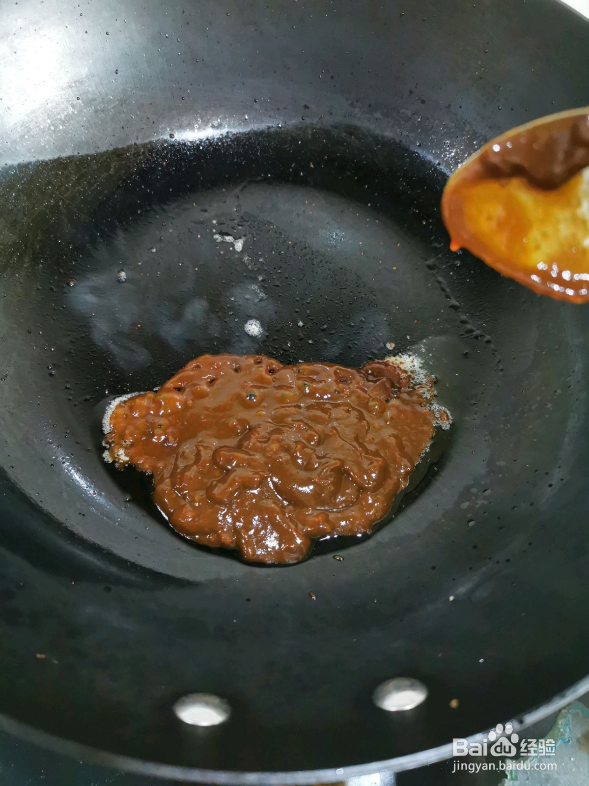 3、国内倒入适量油,炒香豆瓣酱和黄豆酱物狠,豆瓣酱,加一点水,第一防止溅的到处都是,第二稀释一下酱,使它不那么咸,抹的时候不会因为太稠抹不均匀