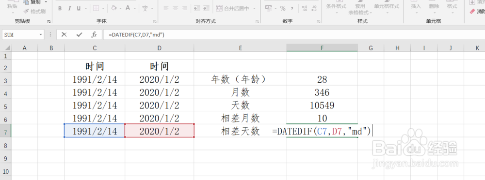 6、 他出生相差有多少天计算,在F7单元格中输入=DATEDIF(C3,D3,"md"),计算结果为19天("MD" 起始日期与结束日期的同月间隔天数, 忽略日期中的月份和年份)。