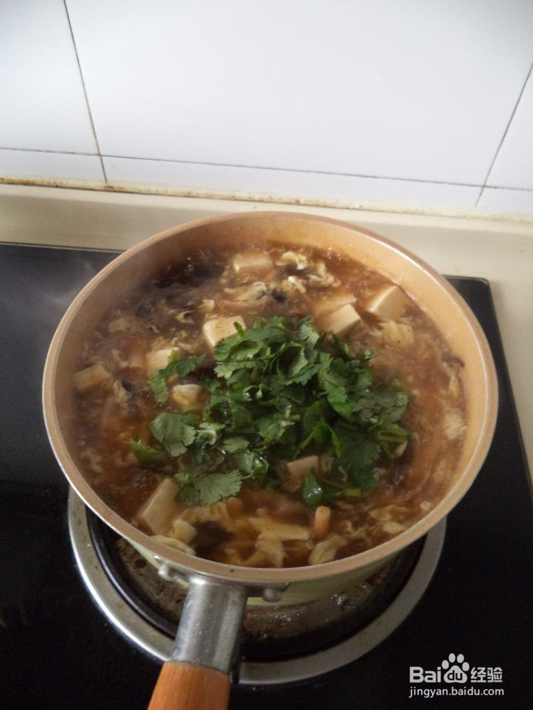 10、搅拌后加少许鸡精,淋入香油,撒上香菜和蒜苗花关火。
