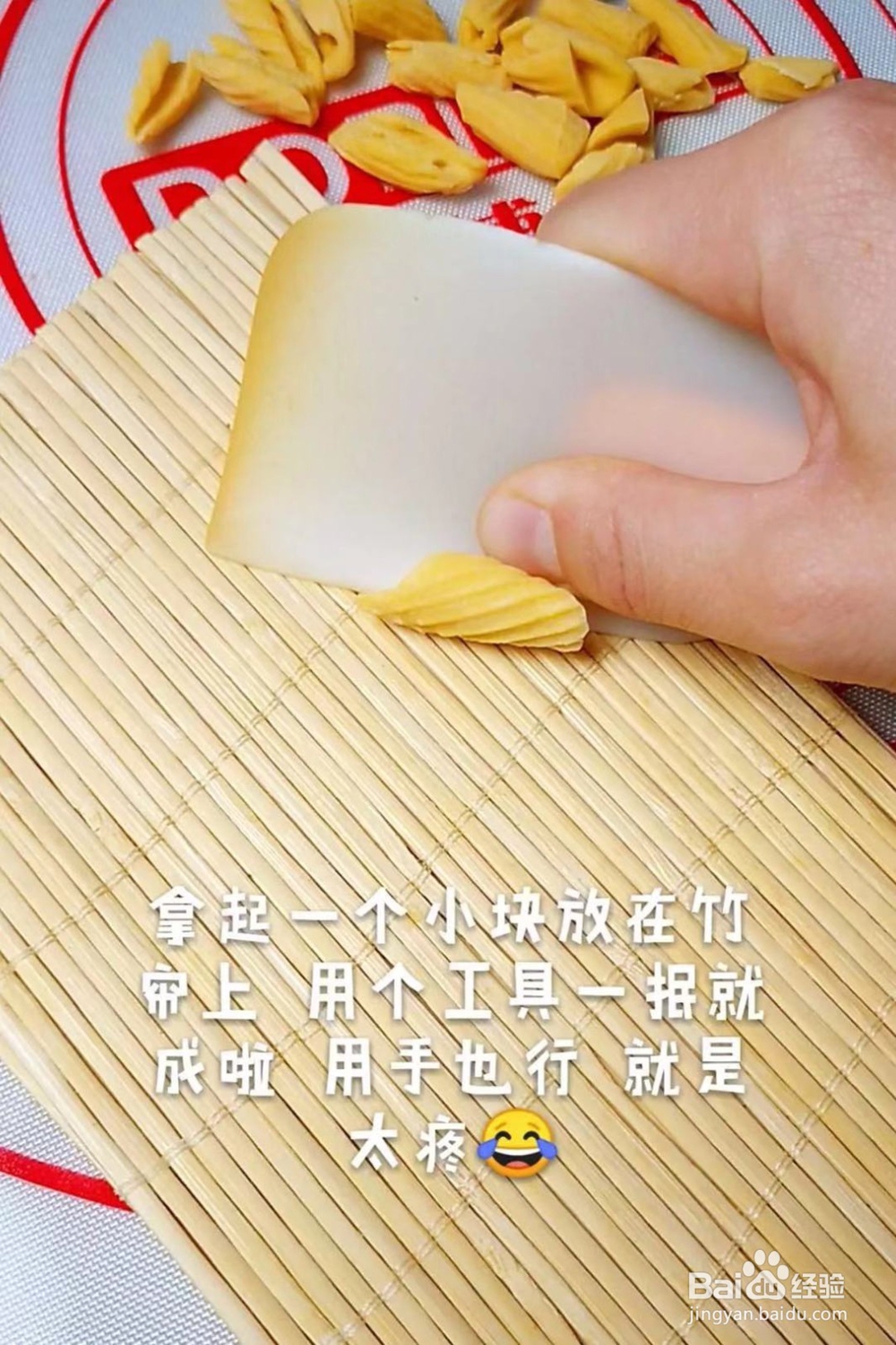 7、接着拿起一小块的面饼放在竹帘上一抿就可以了,如下图所示。