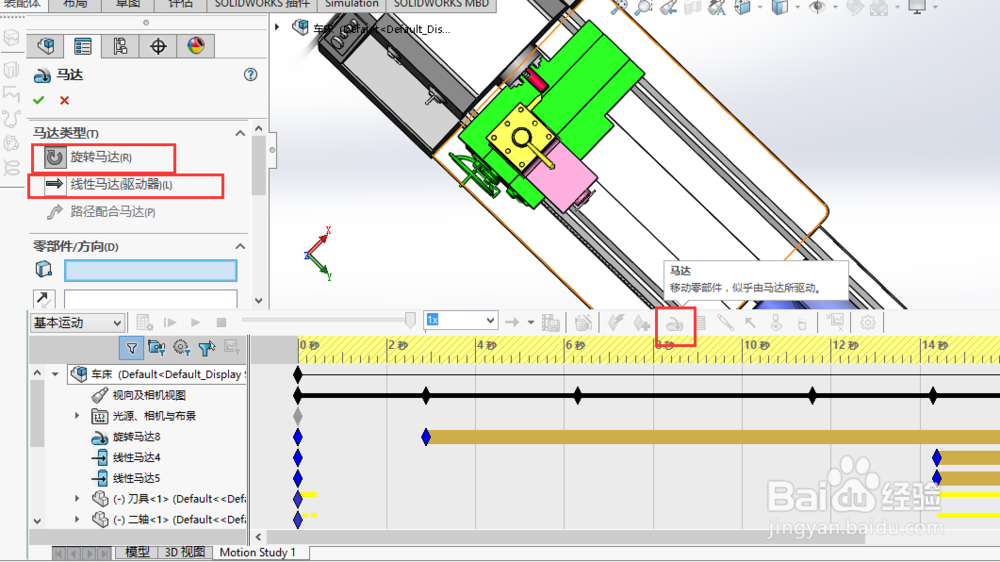 4、设置完旋转马达,包括运动方向,运动形式及其设置。比如:等速形式下的转速,距离形式下的位移、开始时间、结束时间……下面菜单中就会有旋转马达,拖动蓝色菱形可以调节运动时间,按下计算,基本运动开始生成。