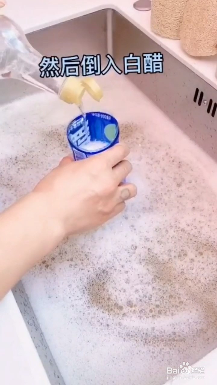 2、接着将瓶子放在出水口,加入小苏打,再倒入白醋。