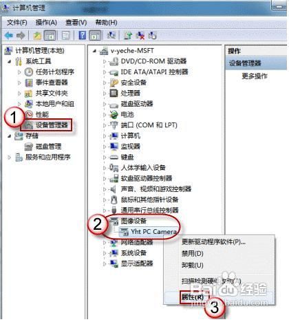 2、在“计算机管理”窗口左边一栏,双击“设备管理器”。然后,从右边栏中找到“图像设备”,点开。在摄像头设备上右键鼠标,选择“属性”。