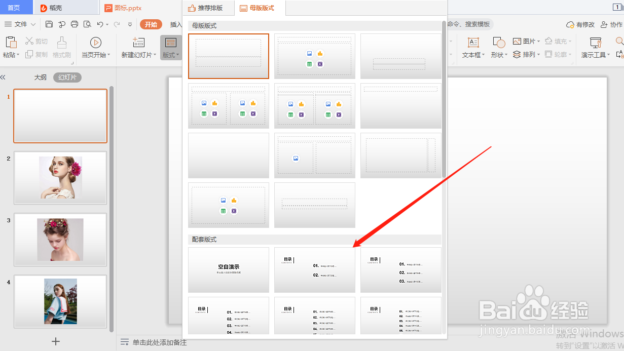 2、点击开始——版式——配套版式;如图