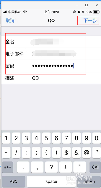 5、第五步:输入QQ账户的邮件名称和密码,并且点击下一步。