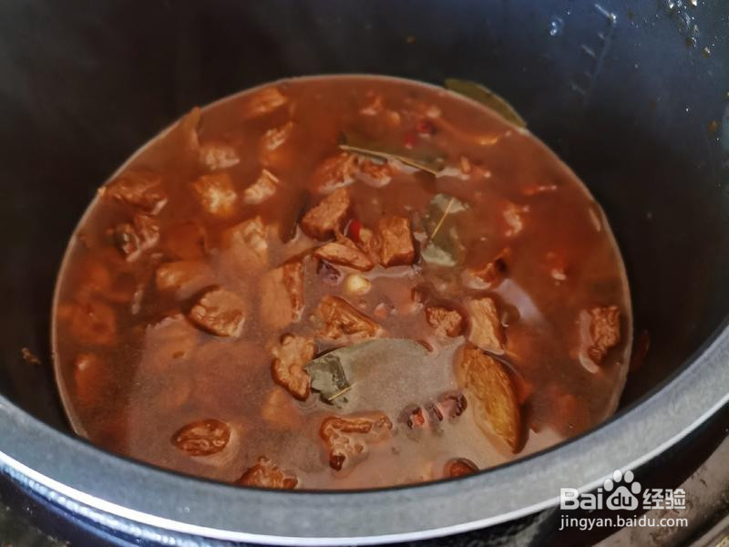 9、然后将牛肉和汤汁整个倒入高压锅炖40分钟(如果时间比较充分,这一步可以将它们倒入砂锅中慢慢炖一个半小时,味道会更好)。