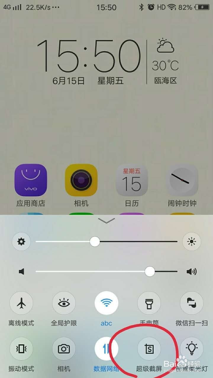 1、手指放在桌面上向上滑,有一个“超级截屏”键。