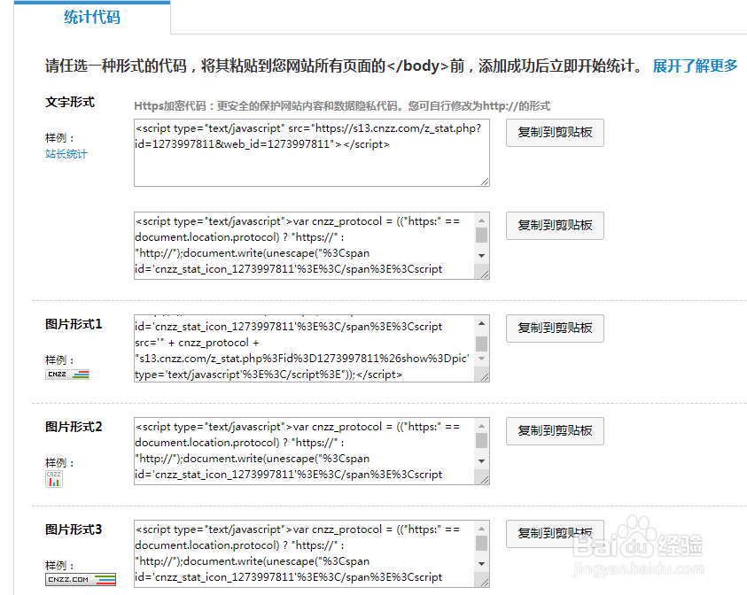 4、设置统计代码,选择喜欢的形式的代码粘贴在网站所有页面的</body>前,如果所有页面调用一个footer网页,可以就添加在footer网页就可以。