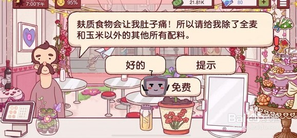 1、首先我们要制作麸质不耐受披萨可以查看提示,发现顾客要的是除全麦和玉米之外所有食材和配料,那么我们就可以进入厨房制作了。
