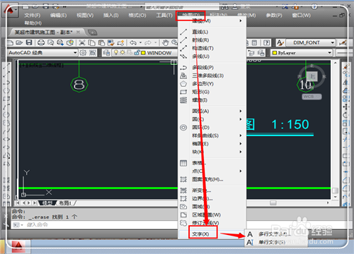 1、单行文字,就是只有一行的文字,这个操作与刚才的多行文字有点点区别。点击“绘图”,然后点击“文字”,这里一样可以绘制多行文字,点击多行文字之后与刚才的操作一样。这里点击“单行文字”。