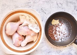 准备好一些厨房纸巾,把鸡腿上血水擦干,擦到表面没有水分干燥的状态(不要省去这一步骤),然后把盐、花椒、香叶八角称重好放在锅中。