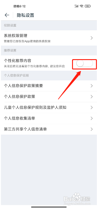 3、第三步:把“个性化推荐内容”右侧的按钮关闭即可,如图所示。