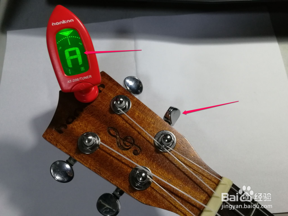 4、然后我们开始进行调音,首先我们调节的是尤克里里的1弦,下图中红色箭头指示位置的调节旋钮就是调节1弦的旋钮,我们一边调节旋钮一边弹对应的琴弦,然后当看到调音器中显示绿色的大写字母“A”的时候,我们就调节好了1弦,如下图: