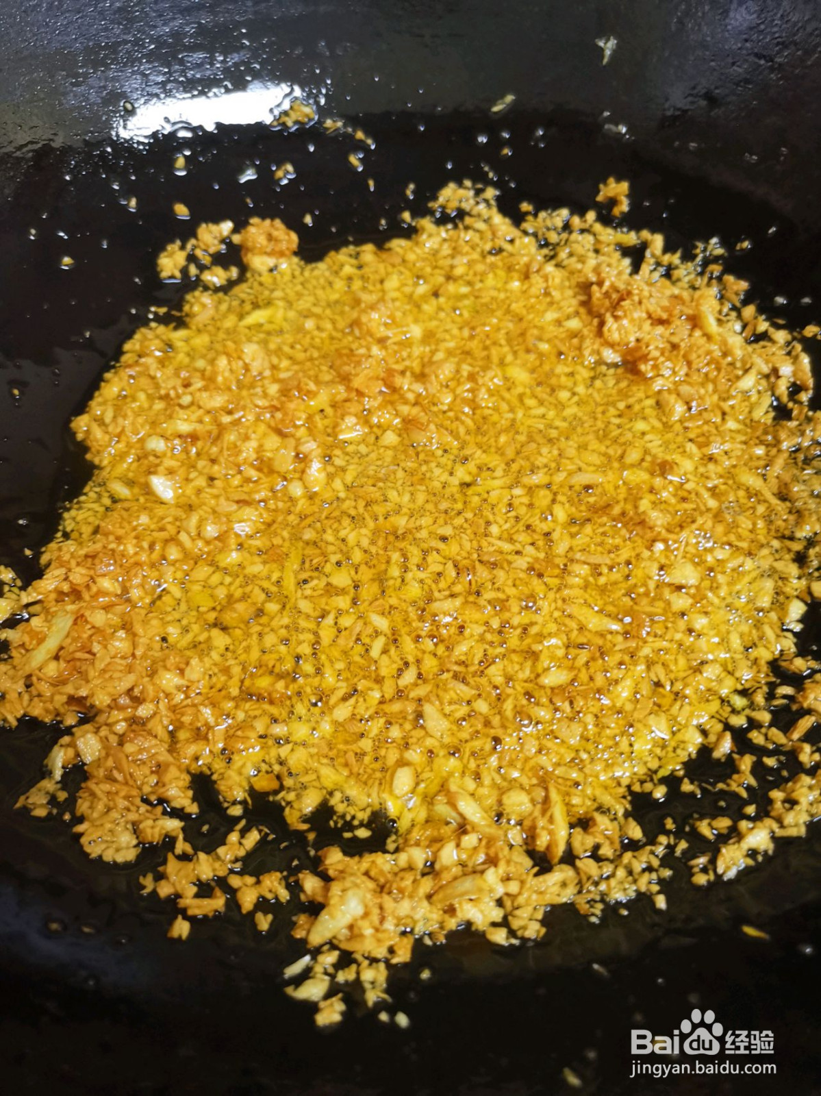 1、起锅烧油,下入2/3的蒜末炒成金黄色