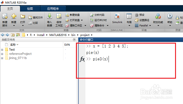 1、第一步打开matlab,在命令行窗口中输入“x=[1 2 3 4 5];pie(x)”,如下图所示: