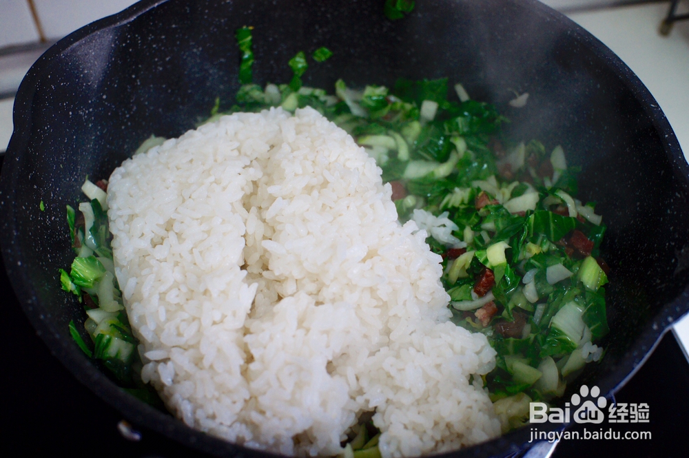 4、加入火腿丁(或咸肉)炒至变色。脂肪部分会油腻的。不要炸得太久。木柴味道不好。