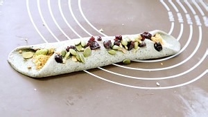 5、将小面团分别擀平,抹一层沙拉酱,放上肉松,两边折起,压一下。然后放上适量蔓越莓、南瓜子,压一下再卷起来。