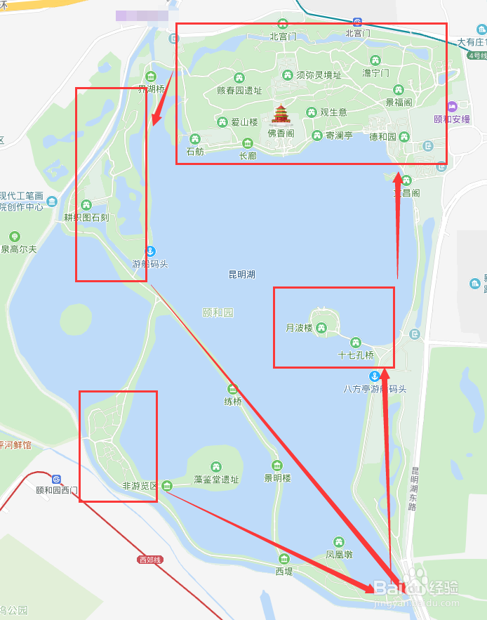 颐和园主要就4各片区的风景,如何所示从西门进去后围绕着该路线转一圈刚好能把园区全部游遍。