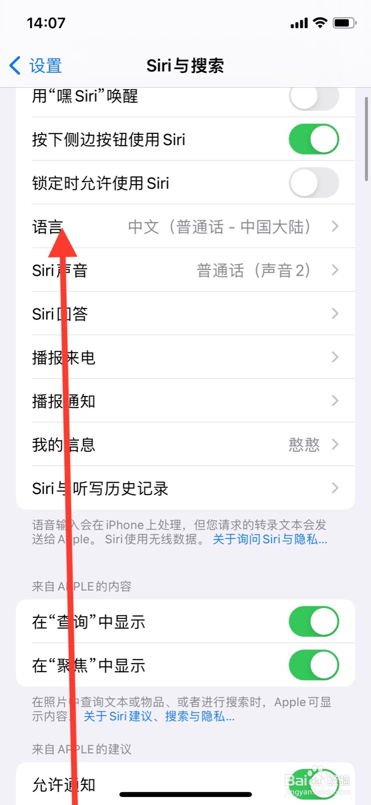 下滑“Siri与搜索”显示页面点击“语言”。