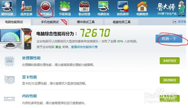 4、点击上面的性能测试,选择测一下可以测出你的电脑综合评分,cpu,显卡,内存等性能信息并得出电脑评分,分越高,性能越好。