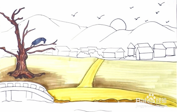 2、然后在石桥三方画一棵枯树,树上只有光秃秃的树枝和一只乌鸦,继续画出远处重重山峦,在山脚下画出村落,小房子一栋挨着一栋,再画上落日,归雁,补充田野间的道路。