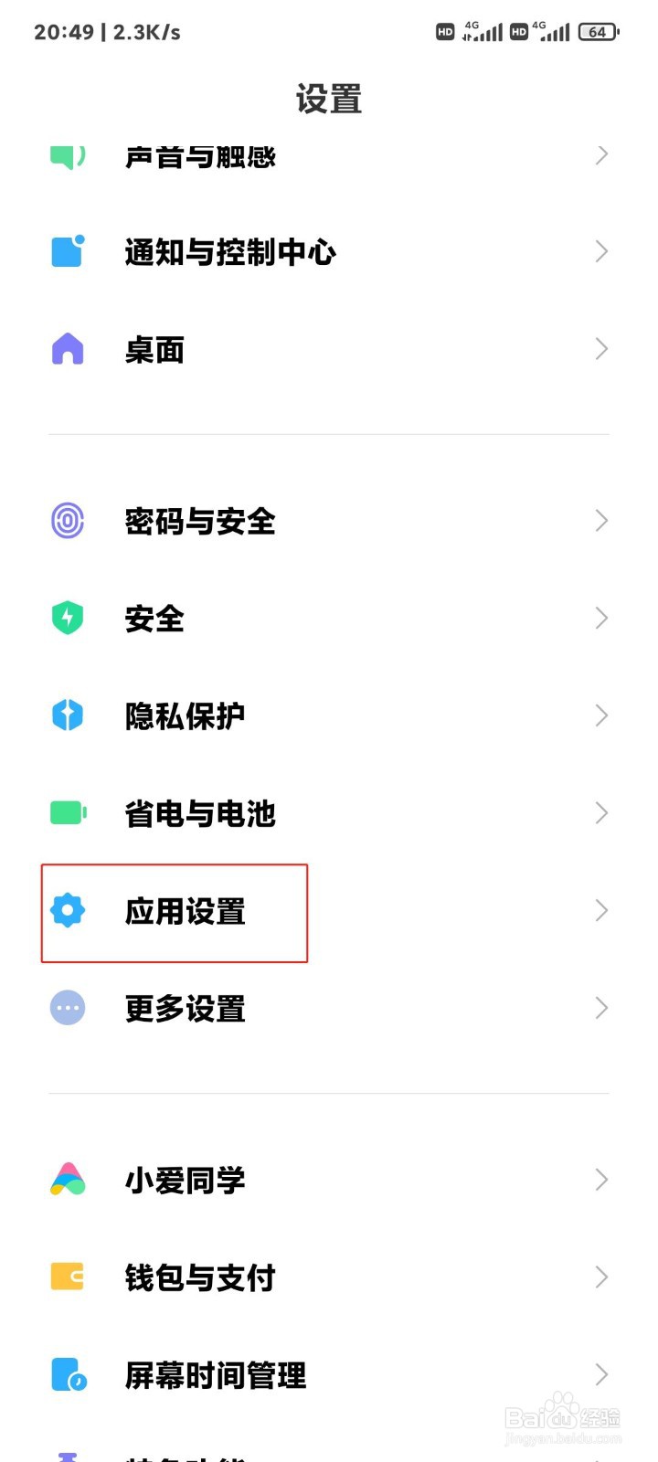2、进入设置界面后,向下滑动,找到应用设置,点击进入。