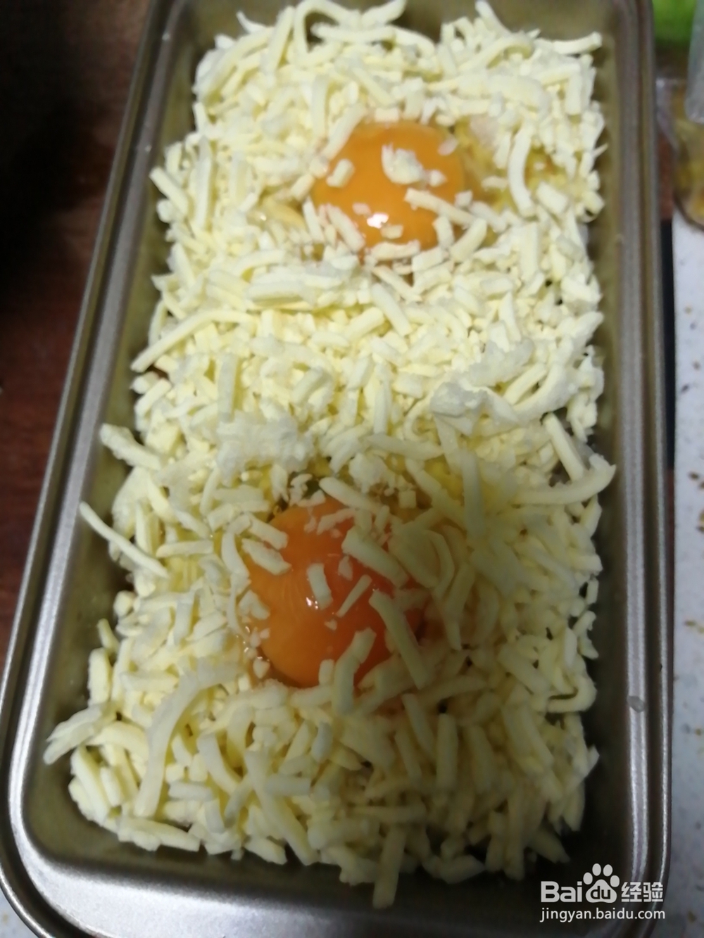 3、先铺一层马苏里拉芝士碎,然后打入两个鸡蛋
