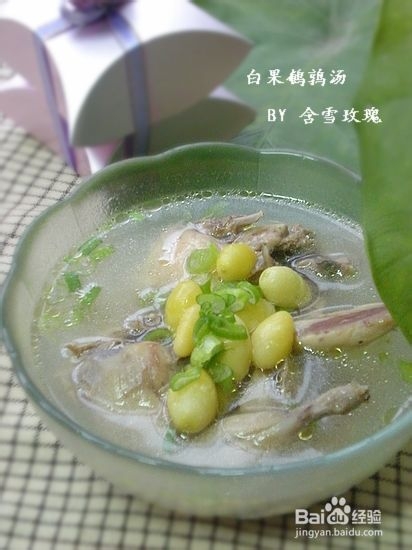 鹌鹑炖汤是比较清淡的,再配上白果,营养更丰富,有时候煎炸食品吃得过多,往往会令口角溃烂,这时候,喝上一碗白果鹌鹑汤,可以有效改善症状