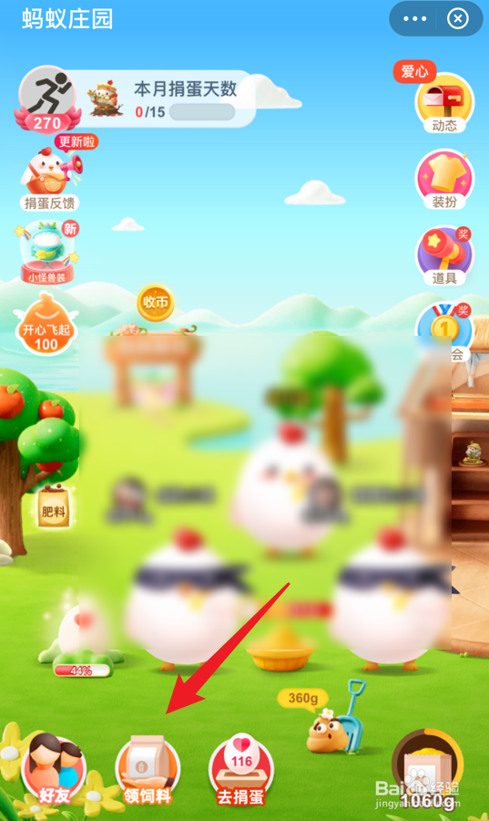 1、进入到蚂蚁庄园页面,点击“领饲料”。