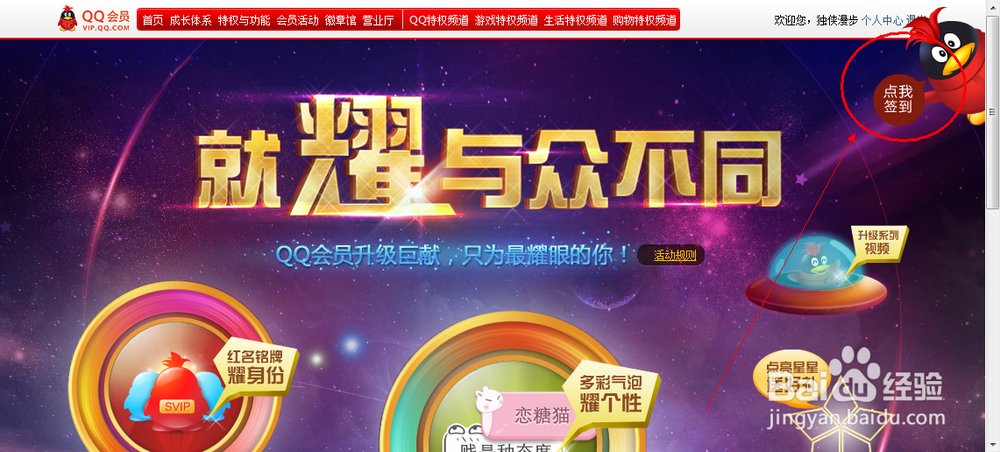 4、在签到页面的右上角会跳出红色的QQ公仔,点击它的“签到”按钮,即可完成会员签到了。